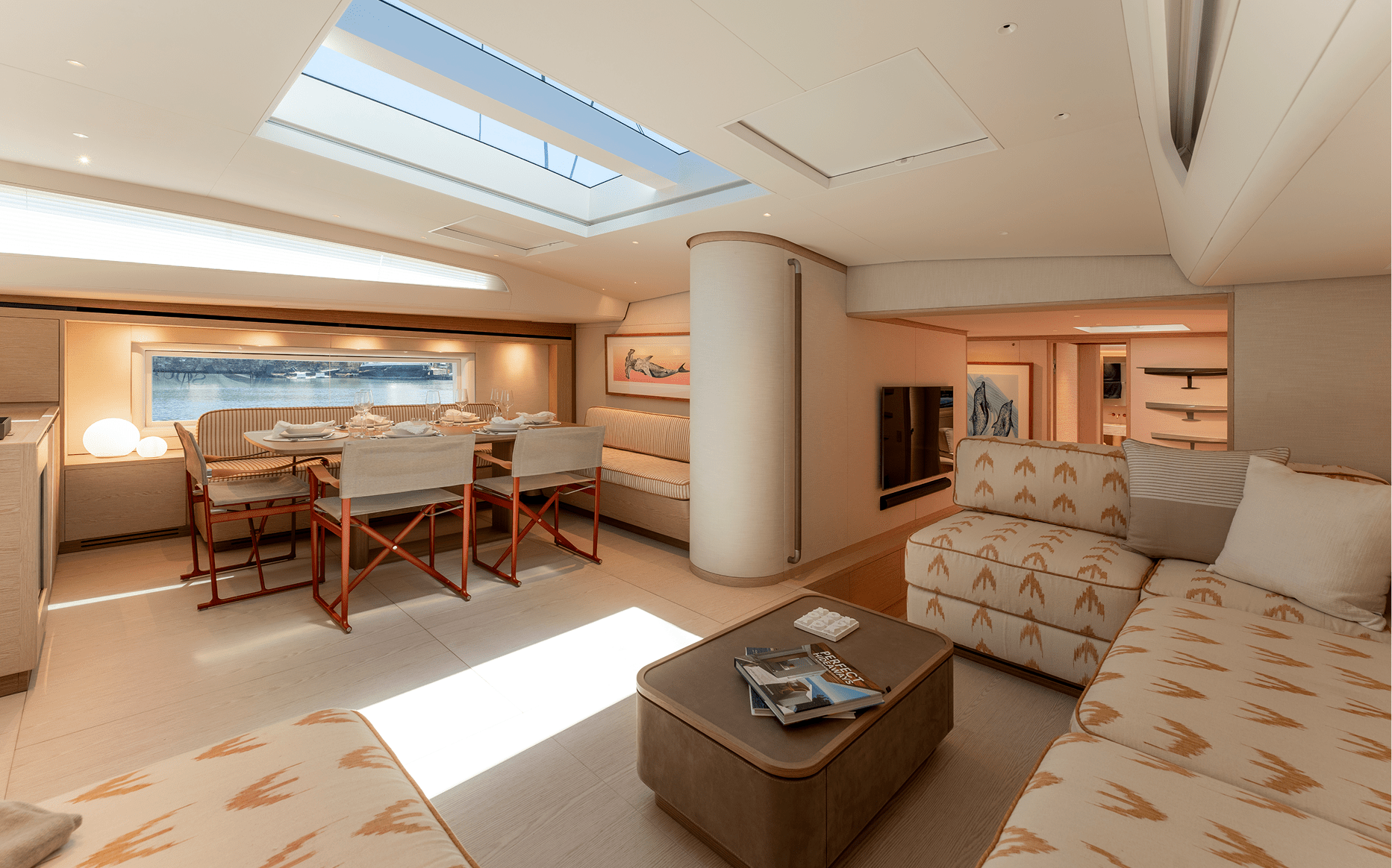 Down below the interior features a four-cabin layout with the owner’s cabin located forward in the quietest area of the yacht, while three guest cabins are positioned amidship. This arrangement creates a spacious and inviting L-shaped social area forward of the saloon, comprising living and dining spaces as well as a TV lounge. The key down here was to produce areas bathed in light while the use of handwoven Mallorcan fabrics gives a more rootsy, homely feel which contrasts with the overall modernity of the yacht.