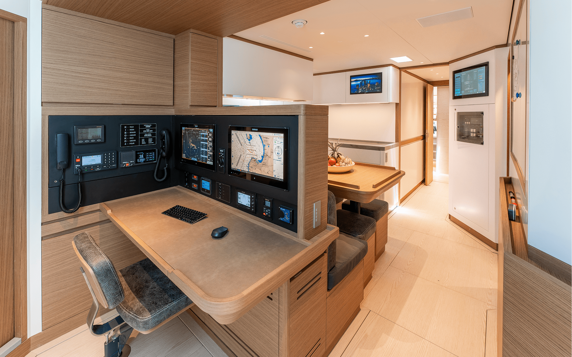 The styling of the yacht was done by Nauta and they have excelled themselves, producing a sporty, elegant yacht with a notably lower profile than many preceding models built by Southern Wind. The black hull also gives her a real sense of dash and the feeling that this boat is built for speed. “She’s very sexy,” Skipper Pasco reflects. The coachroof is low and barely interrupts the flush decks, while the big rig adds to the impression of power. The new boat has many interesting features and one of the notable details is that she boasts a wooden deck which, due to the sustainability issues surrounding teak, the owner eschewed on Kiboko 3 in favour of synthetic teak. However, the team at Southern Wind seem to have succeeded in finding a way around the problem by using maple as a teak substitute. Generally maple would not be considered hard enough to be durable but the problem has been dealt with by heat-treating the wood to toughen it up and increase durability. “It’s a real pleasure to have a wooden deck again,” Skipper Pasco reflects. “In some aspects this is one of the main differences between the new boat and Kiboko 3.”