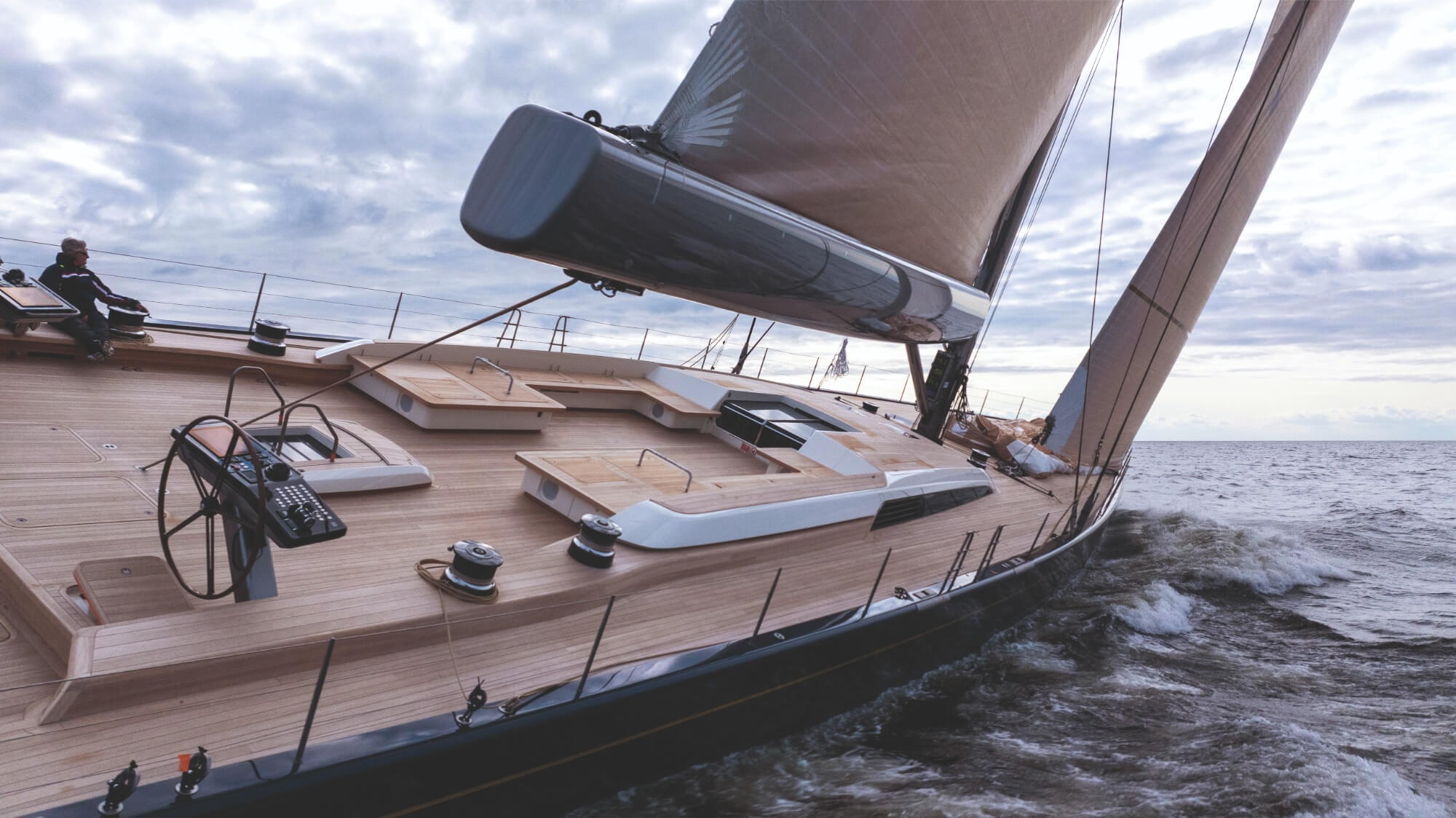“We worked a lot on displacement, and on the draught – it goes down to 6.7m with a telescopic keel. We were keen to go with easy push-button sailing, so there’s a self-tacking jib and a captive winch for both the jib sheet and main sheet.”