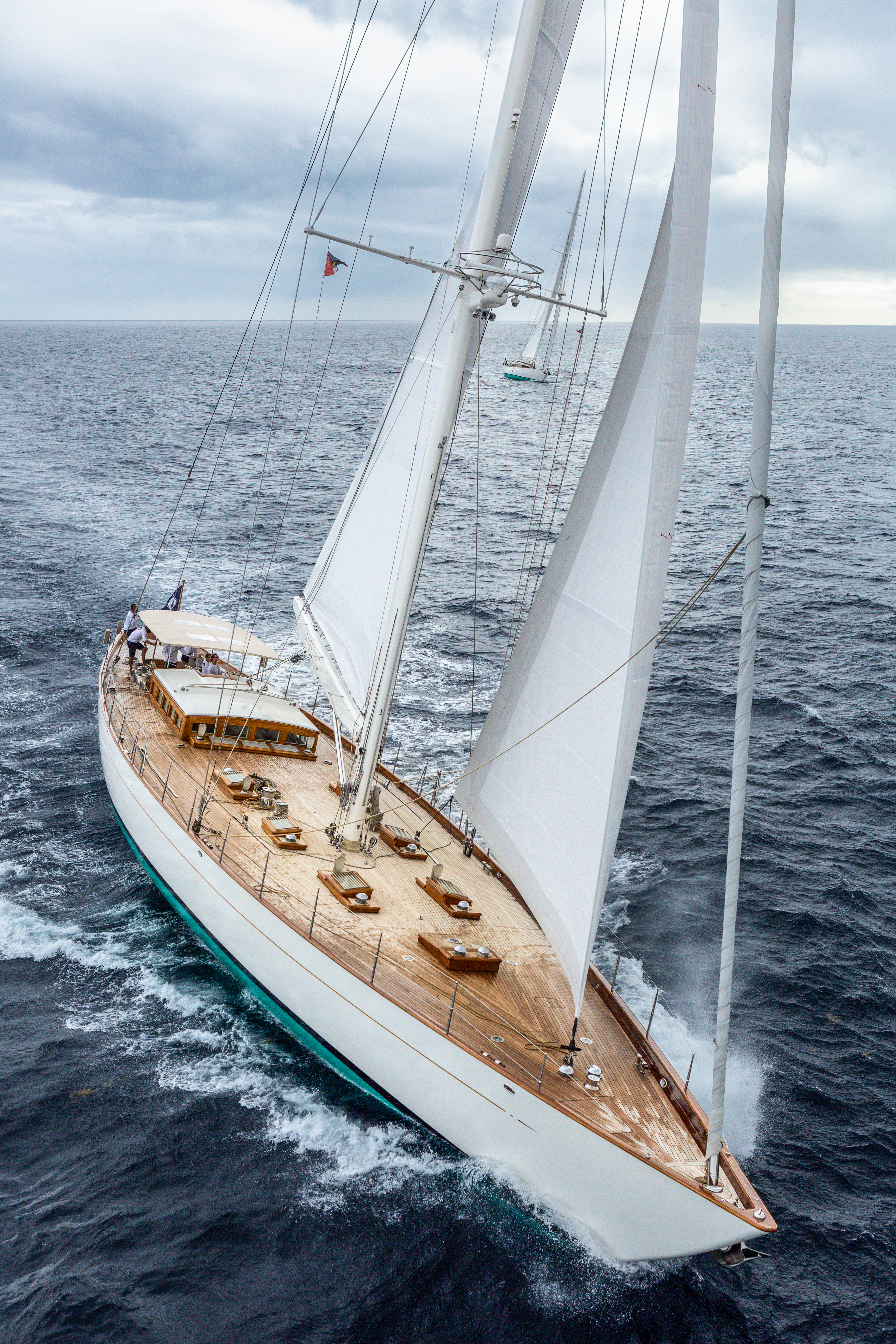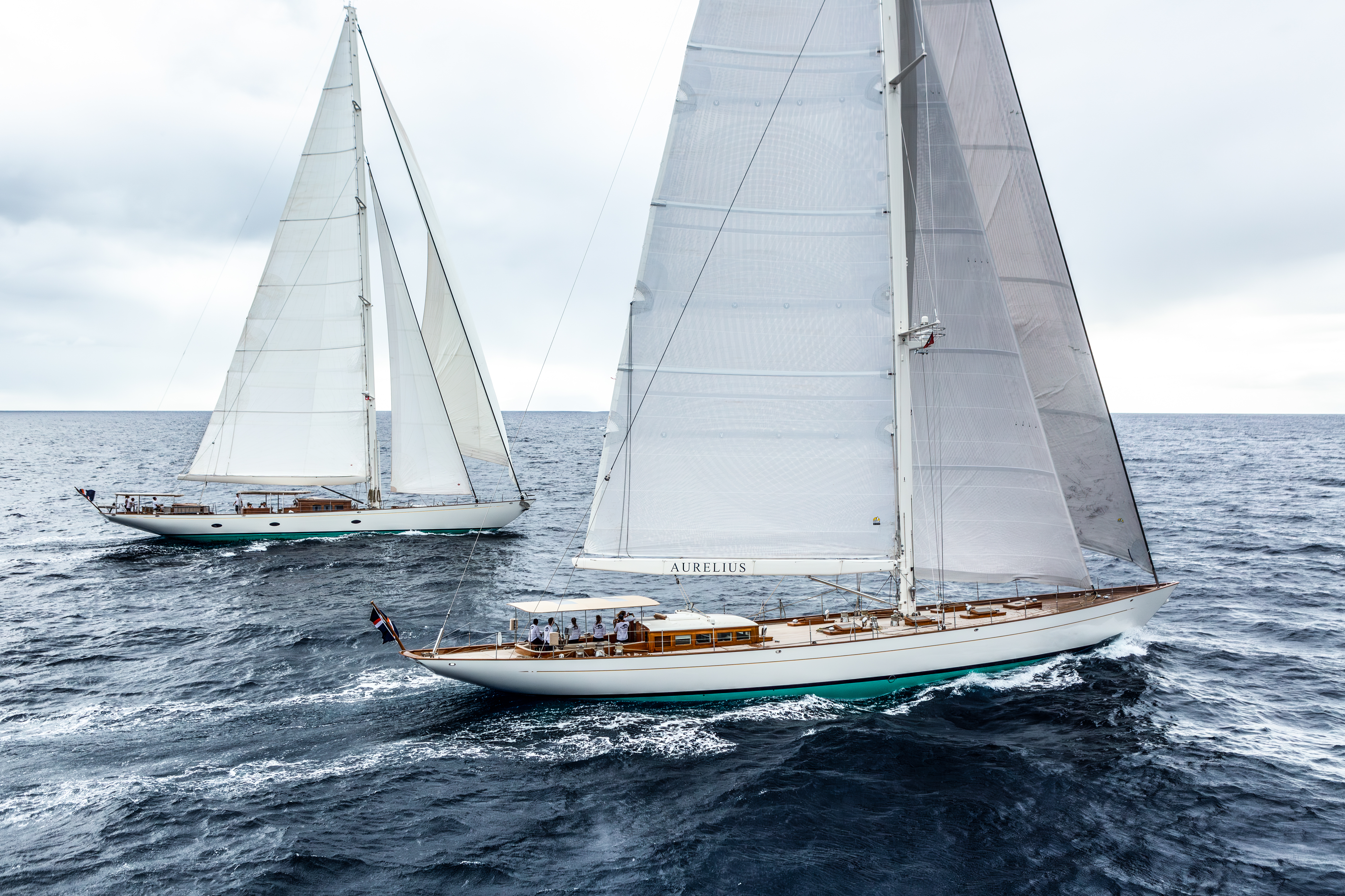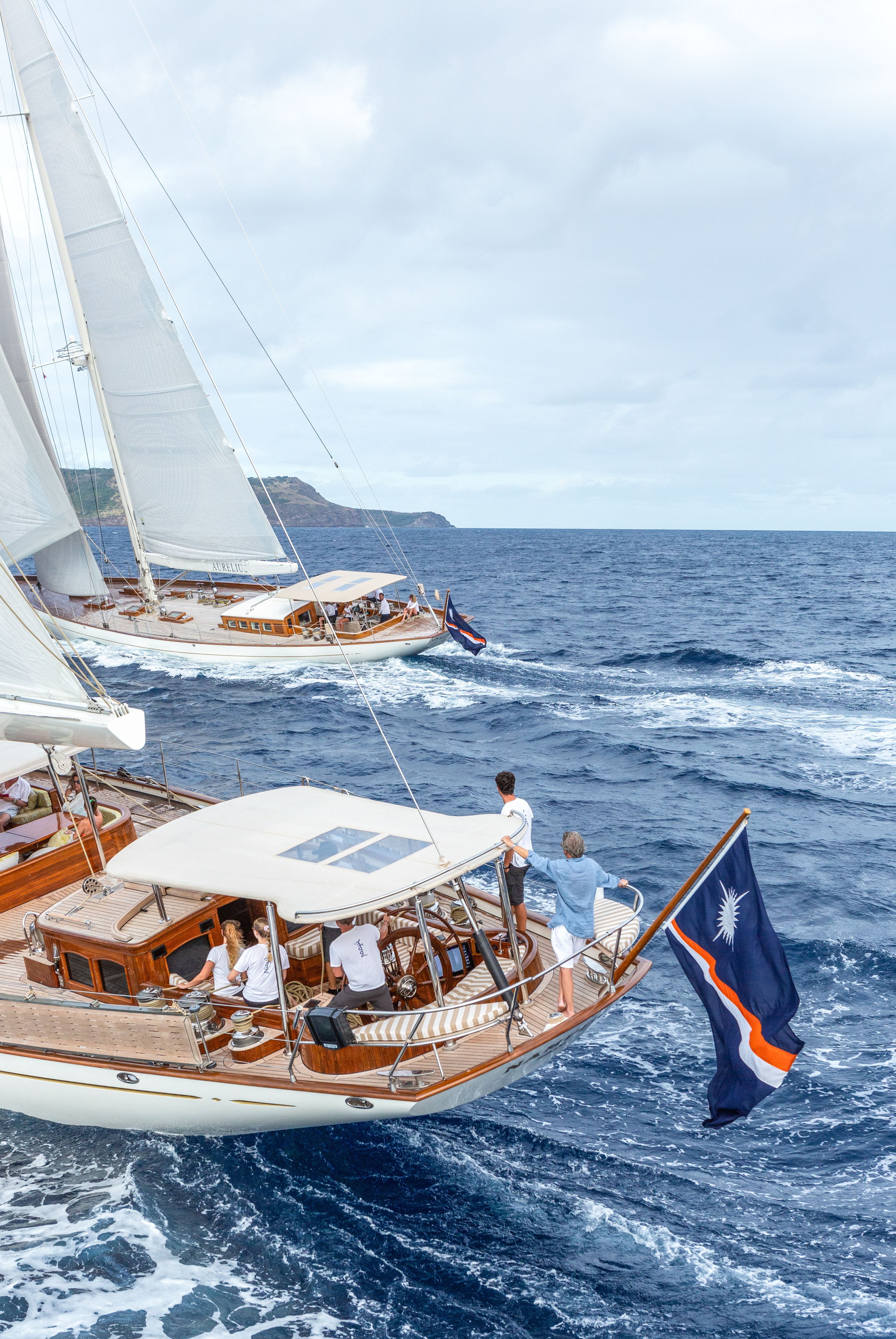 Also there in St Barths, likely competing in the same class as Namuun, will be Aurelius – the second of our two modern classics. She is a serious rival, and not just due to her few extra feet of waterline length. Aurelius was developed with extremely efficient underwater geometry and a fluid deck layout for racing by the same team at Dykstra who breathed life into the new generation of J-Class racers. They have a natural feel for performance and race handling.